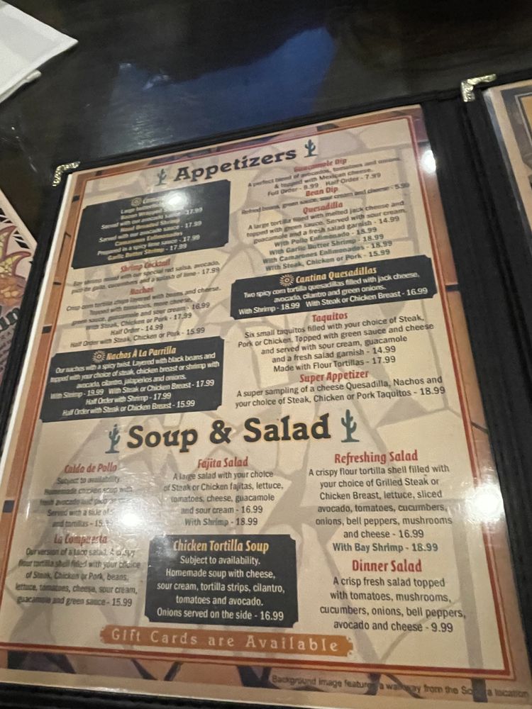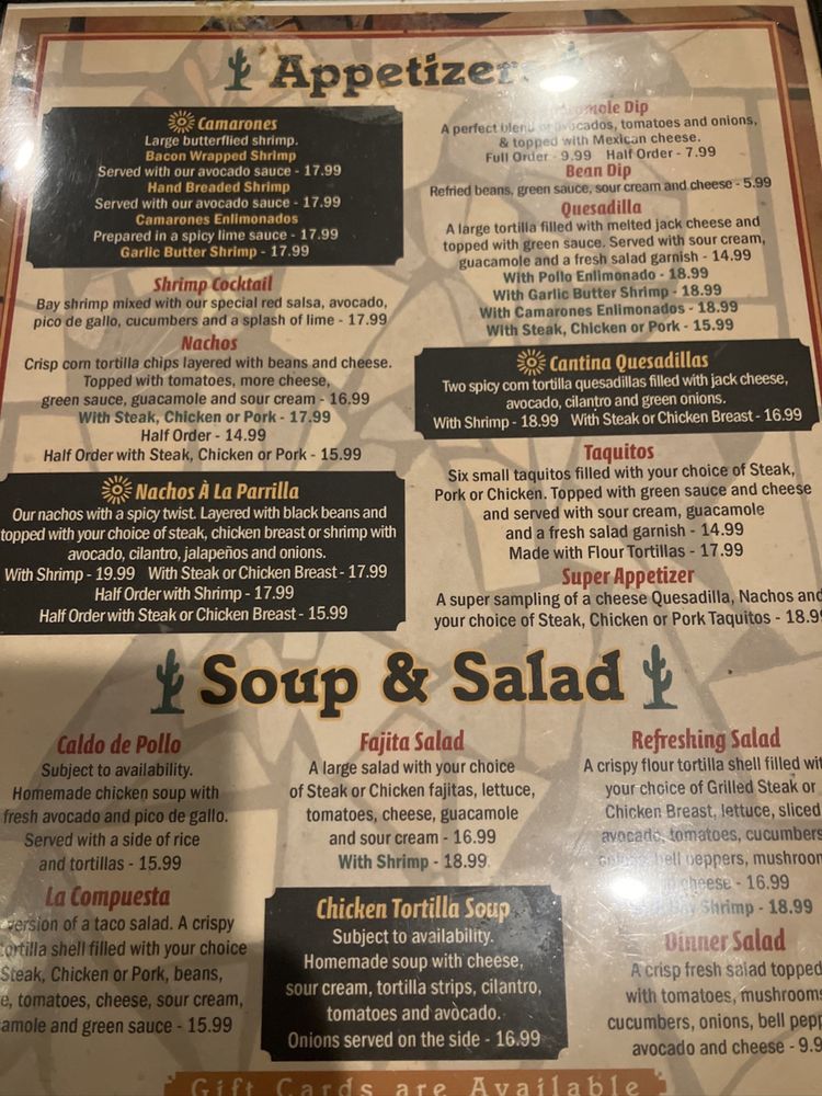 A super sampling of a cheese quesadilla, nachos (no meat, but layered with beans and cheese, chips, more cheese, tomatoes, guacamole and sour cream), and your choice of steak, chicken or pork taquitos.