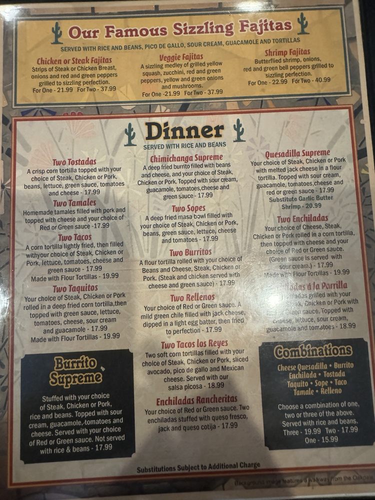 Includes enchiladas, rice and beans, and chips and salsa. Your choice of chicken, steak, pork, or cheese enchiladas. Your choice of Red or Green sauce.