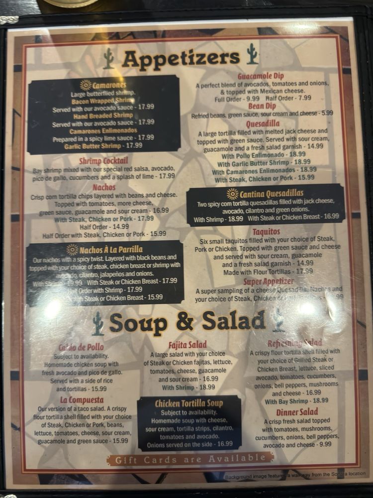 Six small taquitos filled with your choice of steak, pork or chicken. Topped with green sauce and cheese and served with sour cream, guacamole and fresh salad garnish.